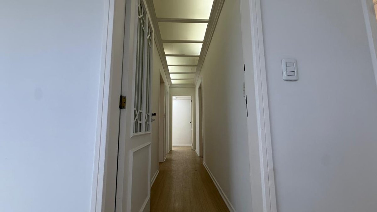 O living é generoso e integrado, e a sacada com churrasqueira a carvão amplia as possibilidades de uso do espaço. A cozinha é espaçosa, a área de serviço é separada e o imóvel ainda conta com dependência de empregada.